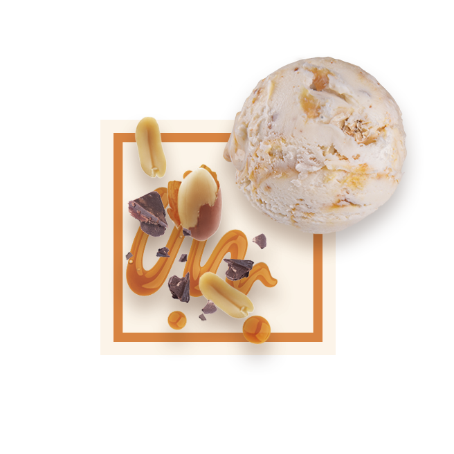 Glace avec marbrage caramel, éclats de cacahuètes et pépites de chocolat Valrhona