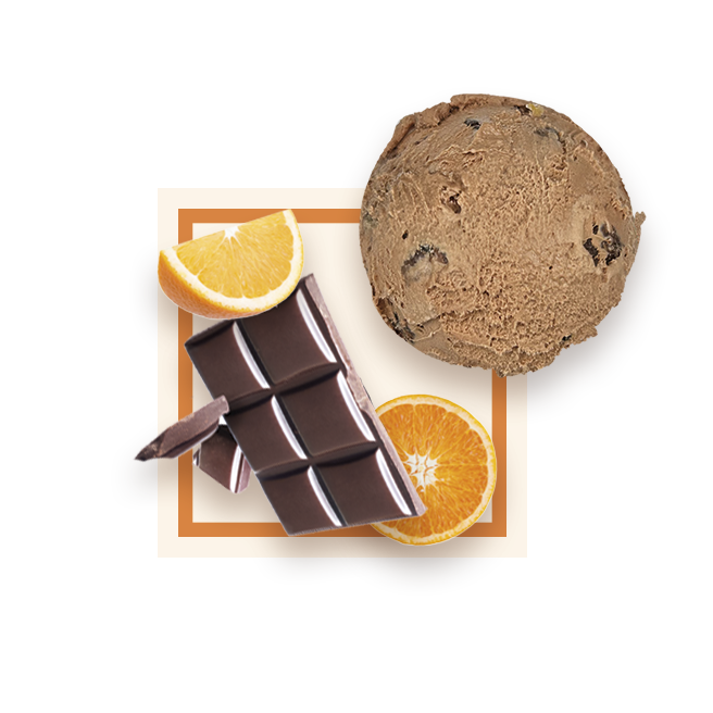 Glace chocolat Macaé de la maison Valrhona® avec morceaux d'oranges confites enrobés de chocolat.