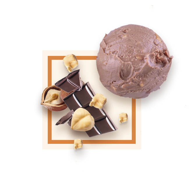 Glace au chocolat Macaé de la maison Valrhona® associée à la douceur de la pâte de noisette et au croquant des éclats de noisettes grillés.
