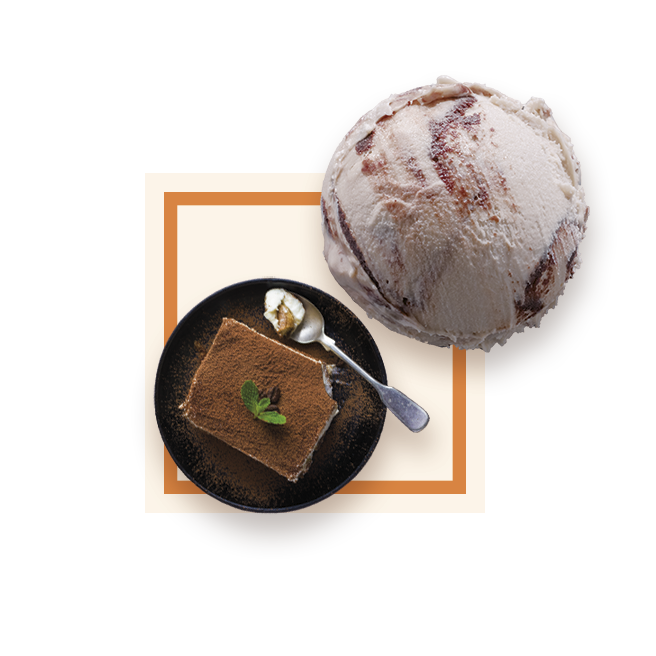 Glace mascarpone parfumée d’un subtil mélange de marsala, café et d’amaretto ainsi que son marbrage au café et ses inclusions de biscuits.