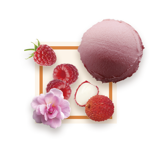 Mélange de sorbets framboise et litchi rehaussé d'un soupçon d'eau saveur de rose. 65% de fruits