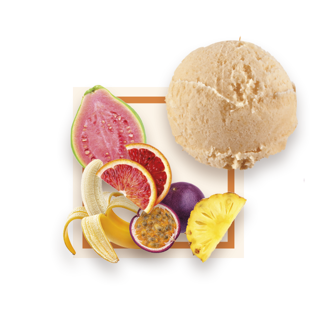 Mélange de banane, goyave, orange sanguine, ananas et passion. 57% de fruits