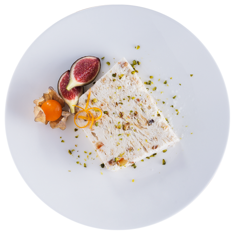 Blanc d'œuf, crème de nougat de Montélimar, brisures de nougat, miel, grains de pistache, praligrains, écorces d'oranges confites.